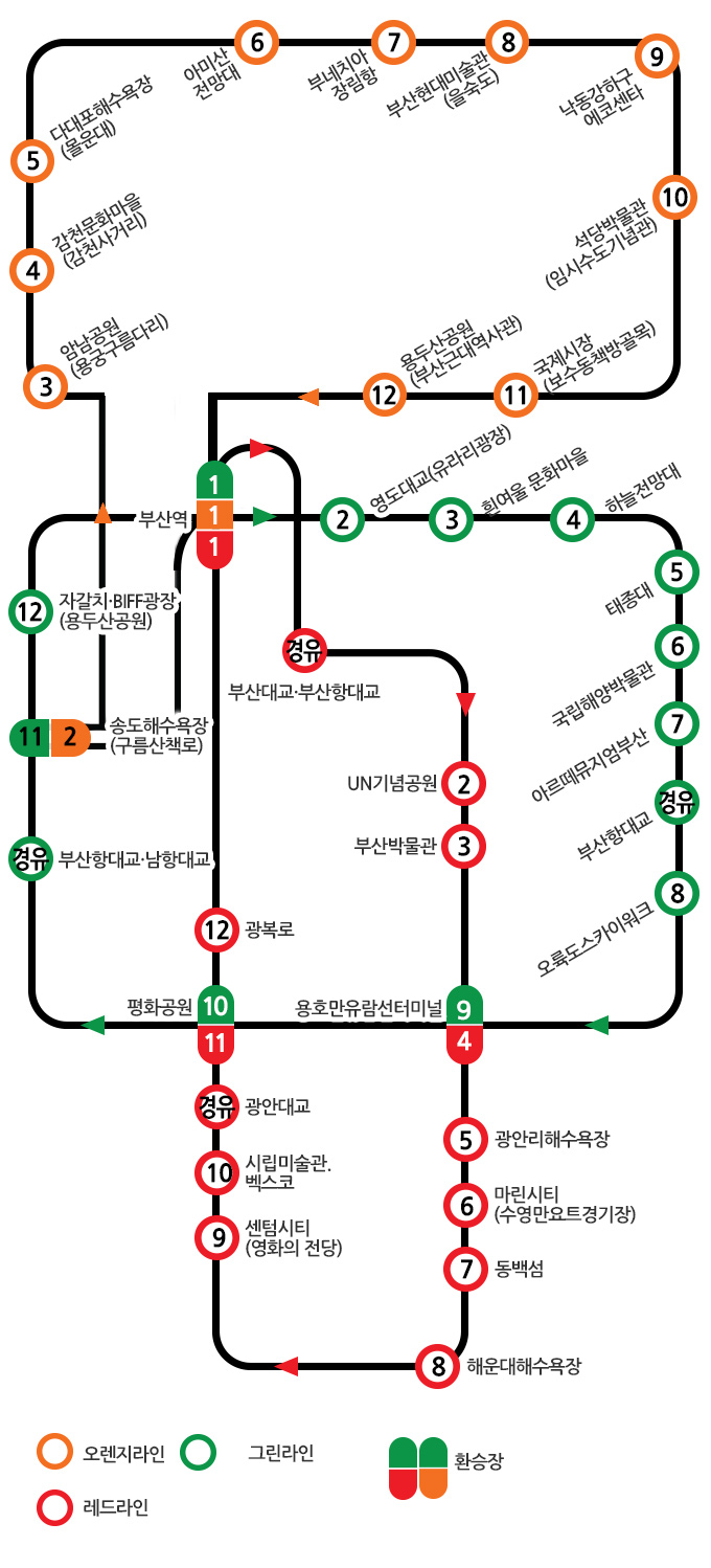 오렌지라인은 부산의 역사와 문화를 체험할 수 있는 코스입니다. 부산박물관, 유엔기념공원, 감천문화마을 등을 방문하여 부산의 깊이 있는 매력을 발견할 수 있습니다.